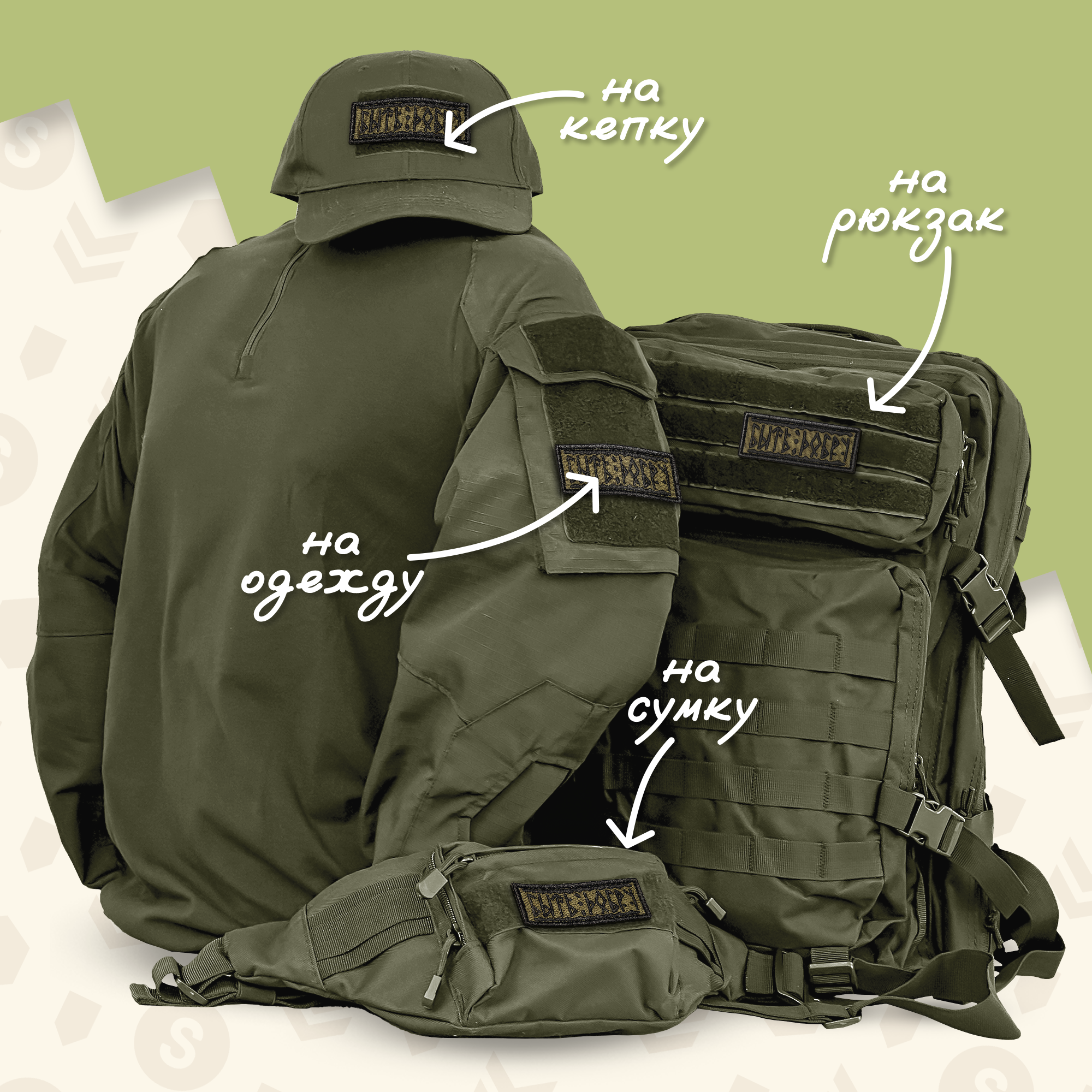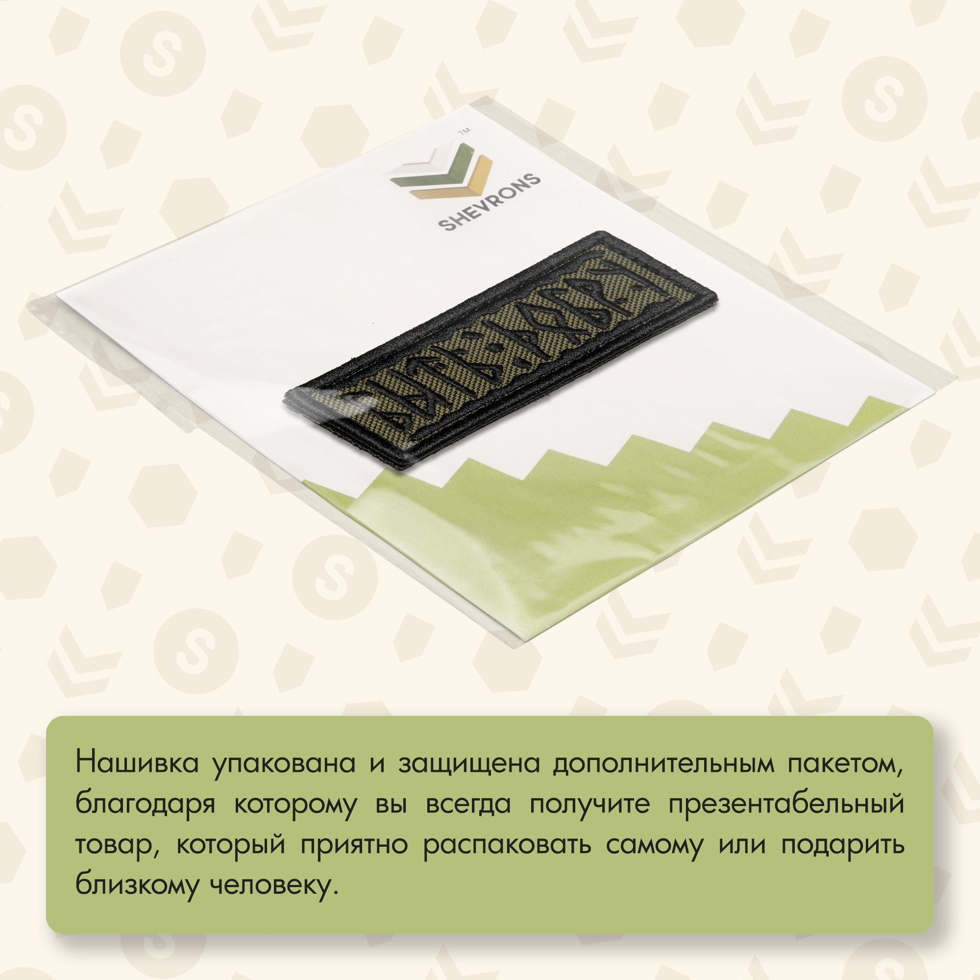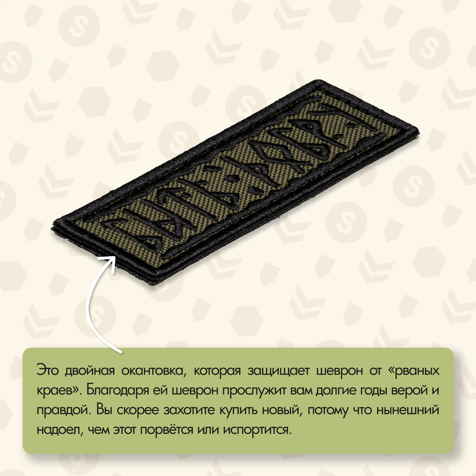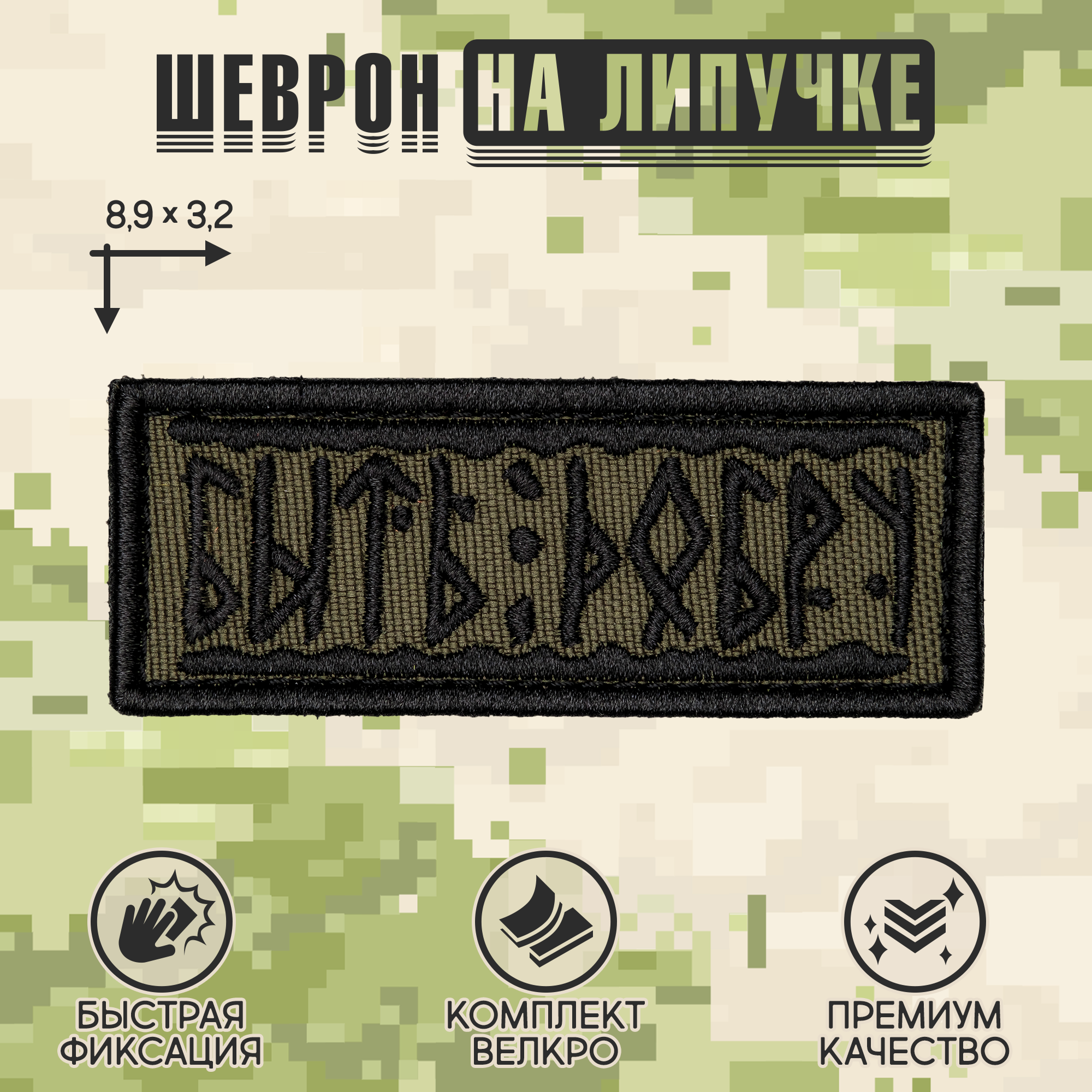 На темно-оливковом фоне черными рунами вышита фраза, которая переводится как "Быть Добру". Но не дайте себя обмануть! Эти руны выглядят так, будто они были вырезаны на камне самим древним воином или мудрецом, а теперь нашли свое место на вашем рюкзаке или куртке. Такой шеврон – идеальный аксессуар для тех, кто верит в силу добра, но готов защищать его с боевым настроем.