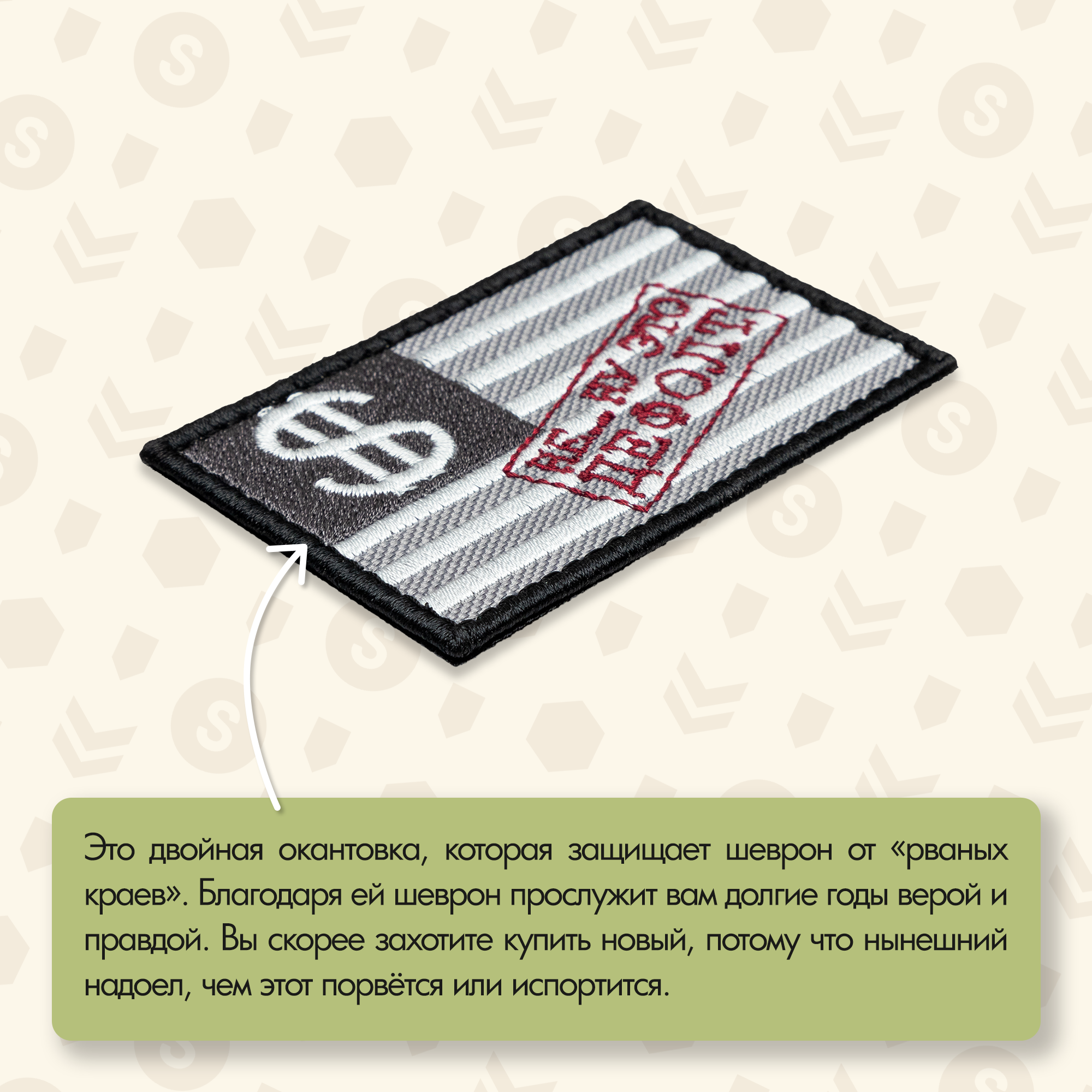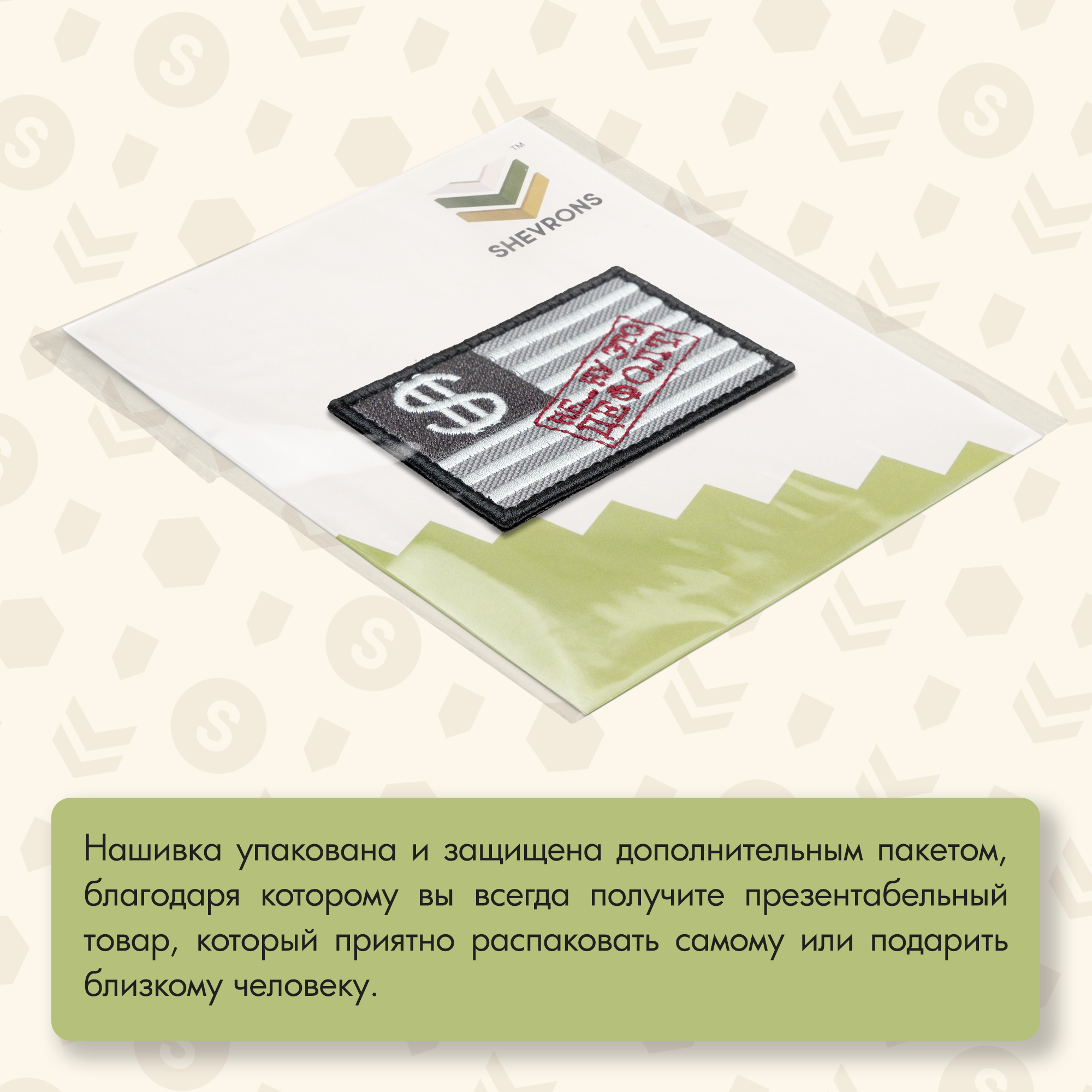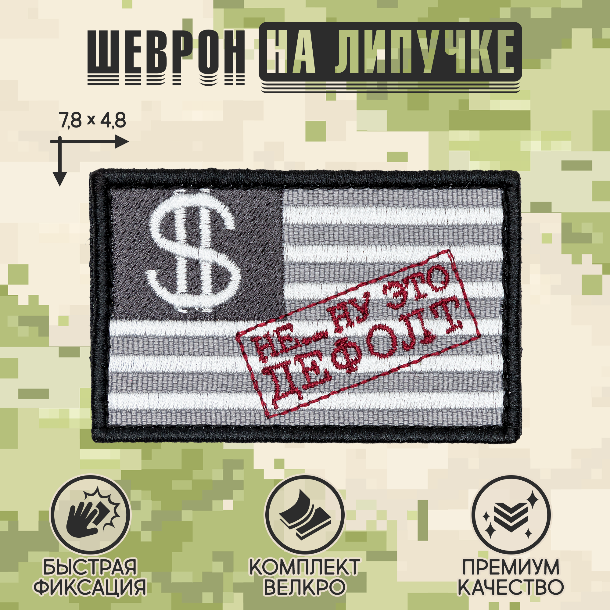 Этот шеврон — настоящее произведение искусства для тех, кто ценит иронию и тонкие намеки на экономические реалии. На нем изображен американский флаг, который претерпел некоторые изменения: звезды заменены на символ доллара, а поверх всего этого красуется ярко-красный штамп "Не... ну это дефолт".
