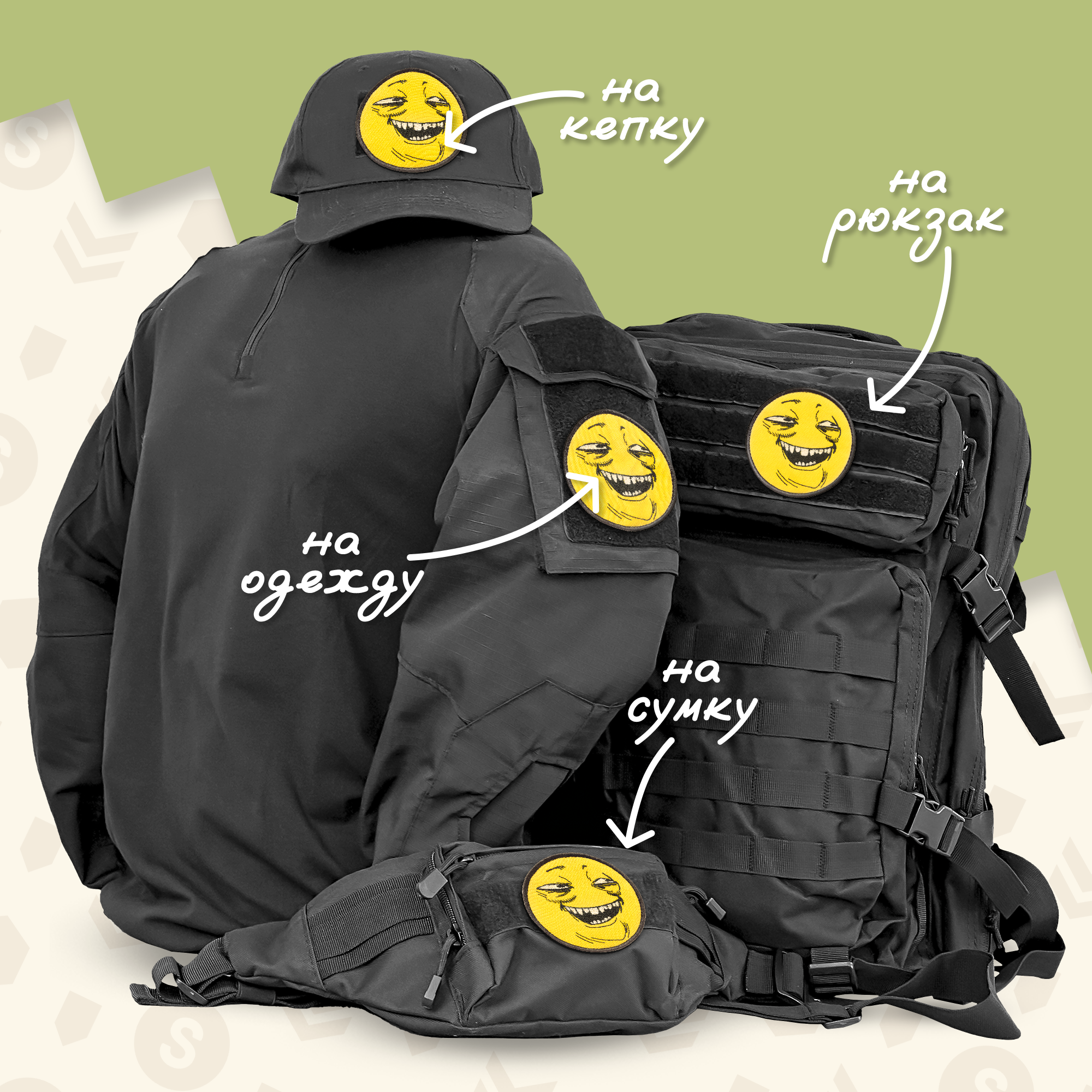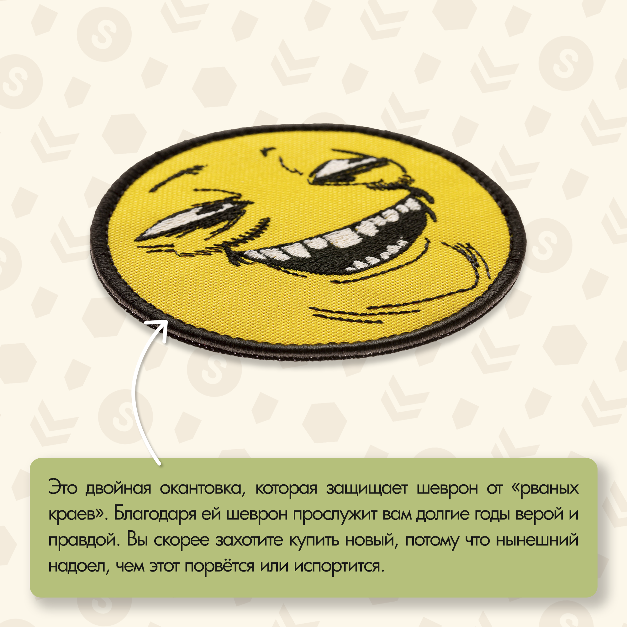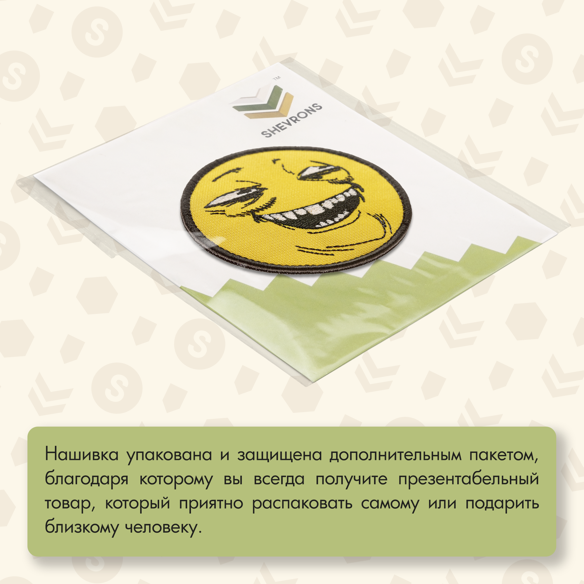 Эмоция, запечатлённая на лице Пеки, говорит о том, что ты знаешь что-то, чего не знают другие, и тебе это явно доставляет удовольствие. Надев такой шеврон, ты словно транслируешь своё настроение и отношение к ситуациям: немного сарказма, немного иронии, и много удовольствия от происходящего.
